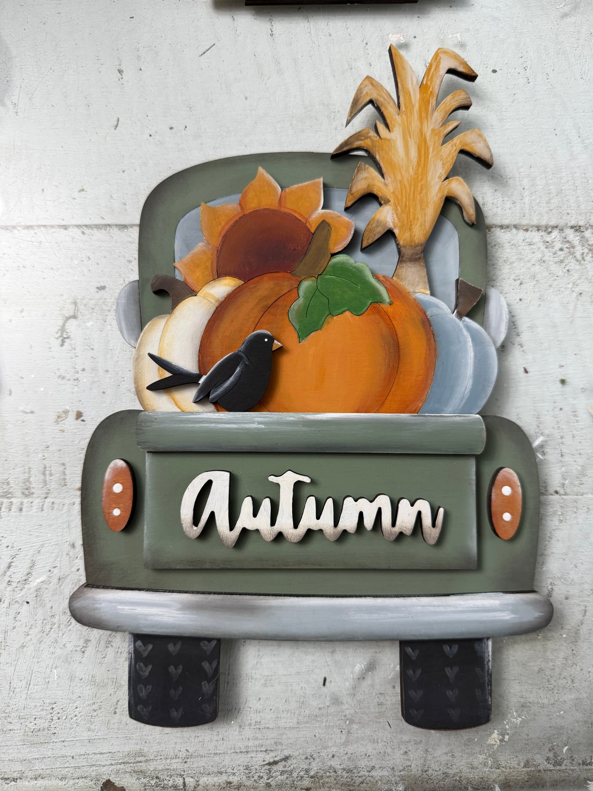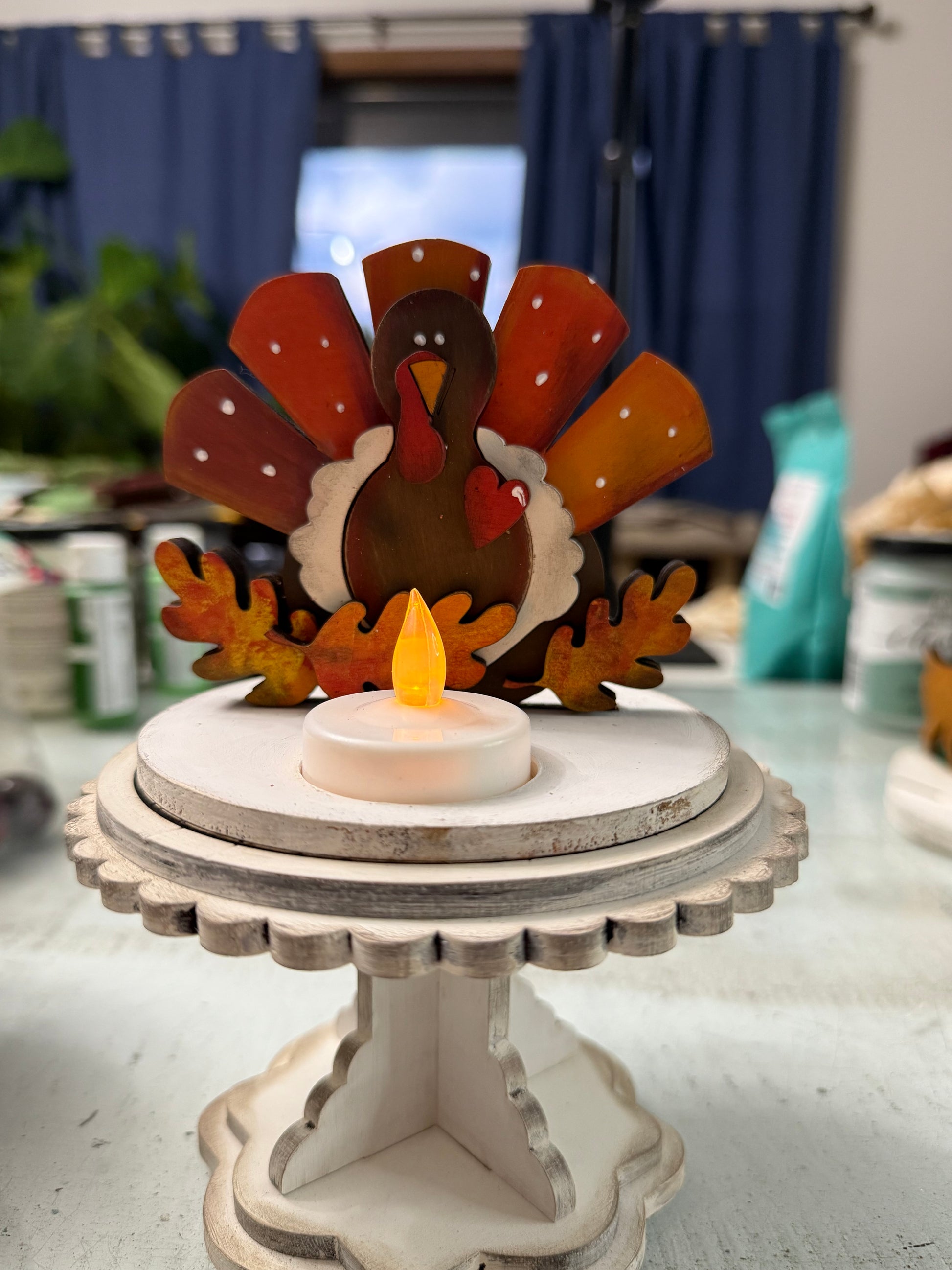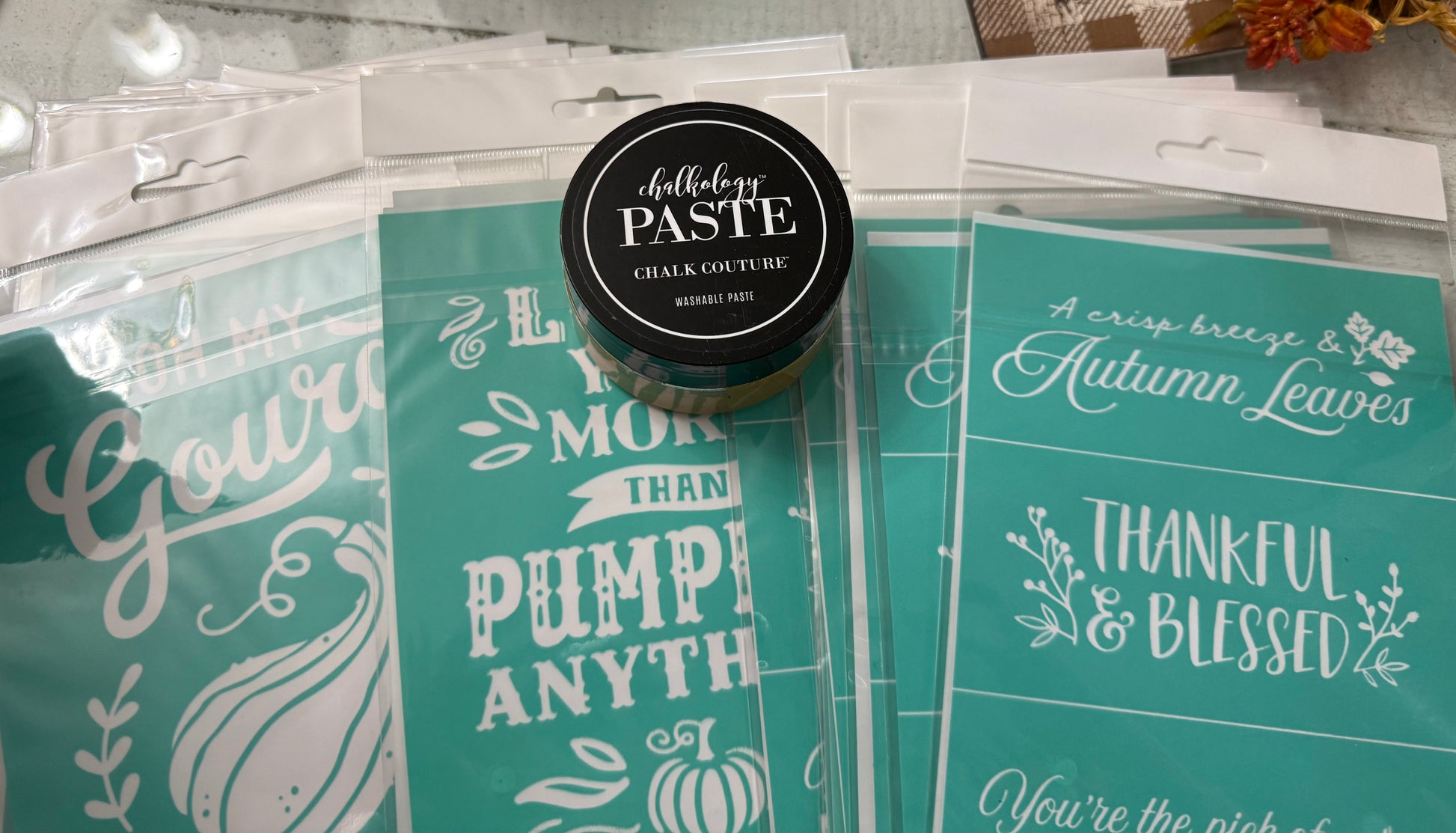 Two cute table top pedestals, a Chalk Couture stencil & full jar of paste (a $25 value), Give thanks sign, ❤️ Fall tag sign, a pumpkin house candle holder, witches hat for your table, and a fall truck! Plus a little reindeer moss I preserved (as long as supplies last)
