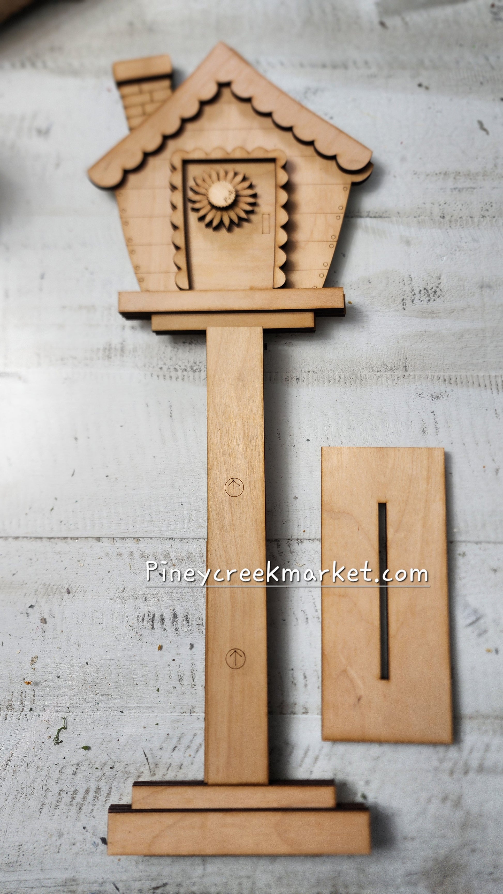 This tall birdhouse about 24 inches assembled can be interchangeable! It comes with the sunflowers. They can be attached with velcro or glued on permanently. Let me know if you'd like more seasonal interchangeable pieces!